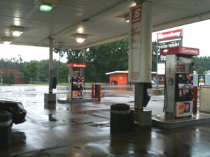 突然、サンダーストームに襲われる。慌てて、ガソリンスタンドに避難。